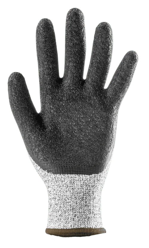 Tricot gris chiné sans couture à base de HPPE, fibres minérales, polyamide, élasthanne. Enduction palmaire en latex noir avec finition adhérisée, poignet tricot. Grip exceptionnel en milieu humide, durable et peu salissant. Pack de 10.