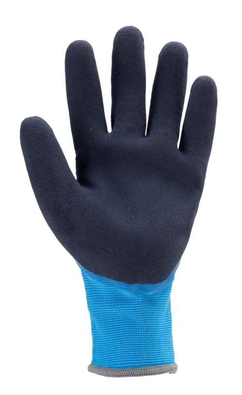 Tricot bleu sans couture à base de polyester, doublure en bouclette acrylique grise. Double enduction latex lisse bleu sur main complète et mousse de latex bleu foncé sur la paume, pouce enduit, poignet tricot. Double enduction pour plus d’étanchéité, bon grip en milieu sec et humide, souplesse et dextérité. Pack de 5.